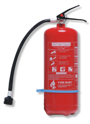 L’extincteur à eau est destiné aux feux de classe A (bois, papier, tissu). Il agit par refroidissement pour éteindre les flammes et éviter leur reprise. Il existe en version sans additif, pour les feux solides, et avec additif, plus efficace grâce à une meilleure pénétration. Il ne doit pas être utilisé sur des feux électriques ou de liquides inflammables.